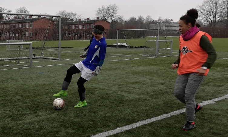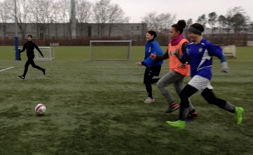 8 damer og en spillende-foreløbig-træner havde en fest. Klassisk opvarmning med høje knæløft og mavebøjninger. Dernæst øvelser med bold: Inderside-afleveringer med højre og venstre benet, zig-zag med bold, Ajax-trekant, m.fl. Og selvfølgelig kamp til sidst, Horst Wein, 4 mod 4 og én udskifter, med masser af fine detaljer, fx. Laudrup-finten, her udført af Henriette, der trækker bolden smukt bag om støttebenet med undersiden af foden, skifter retning - og fuldstændig overrumpler Renata.