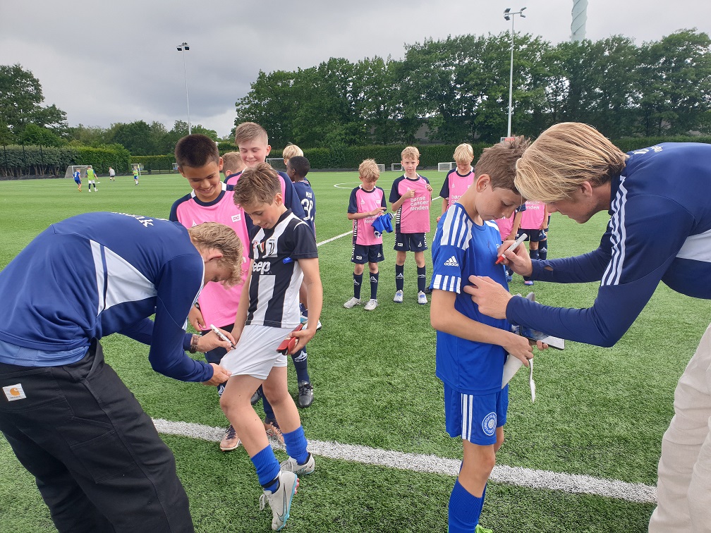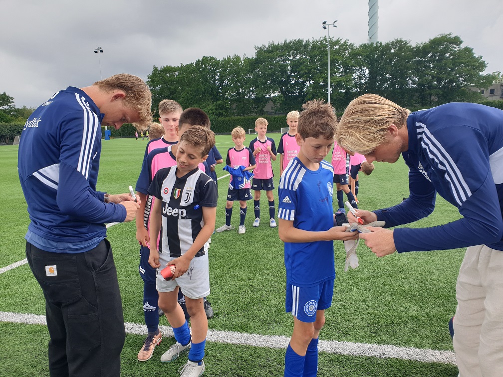 Torsdag var der fint besøg, idet Johan Meyer og Gustav Mortensen fra Lyngbys Superligatrup kiggede forbi og skrev autografer på kort, i bøger, på trøjer, på støvler - et stort hit blandt børnene.