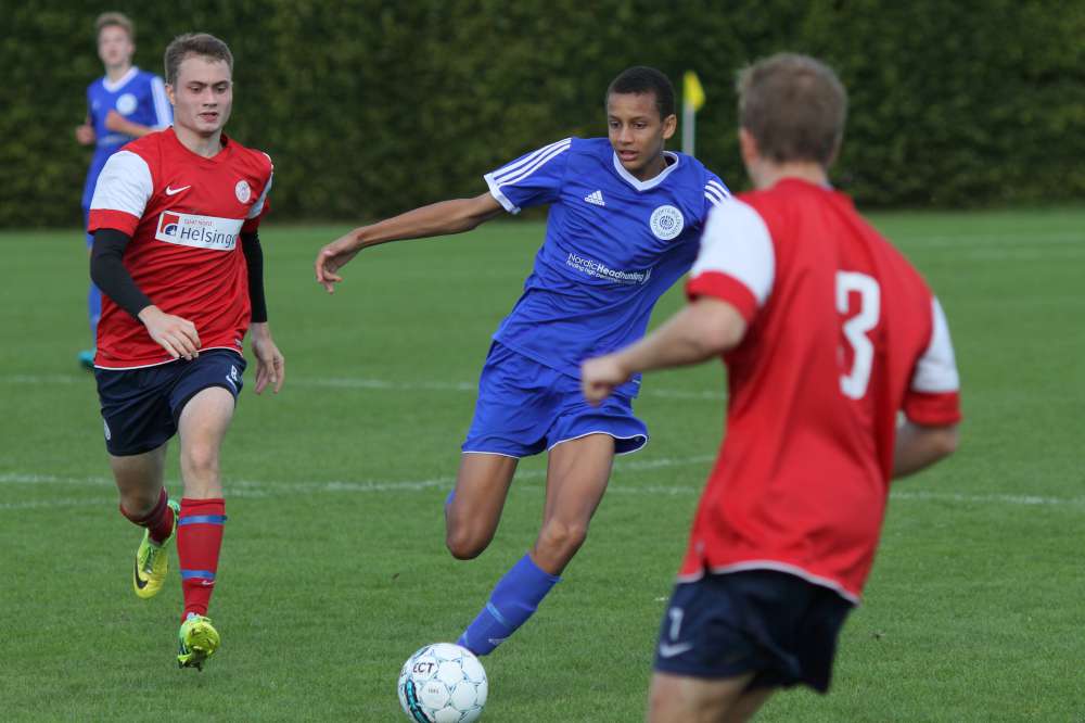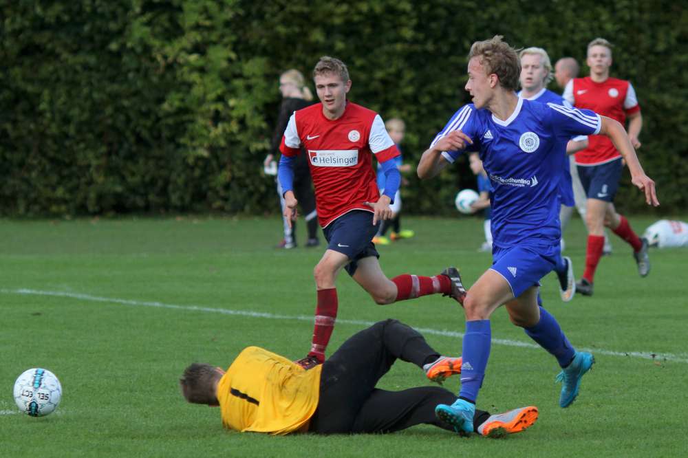Og drengene tog oplægget til sig og var klar fra start. Lundtofte sad på spillet fra første fløjt og havde allerede efter 2 minutter en kæmpe chance. Vores kanter skabte en god bredde og gav desuden mange spilmuligheder på midten af banen. Og vi producerede chancer på samlebånd, men manglende skarphed betød, at der skulle et straffespark til, før der kom gang i scoringen. Efter 8 minutter blev Seb fældet i feltet, og han scorede selv sikkert. Det gav ro på spillet - næsten for meget ro. Det var som om, spillerne allerede tænkte "den er hjemme". Lundtofte havde næsten alt spillet og alle mulighederne, mens Helsingør ikke fik mange muligheder i første halvleg. Der skulle dog gå 32 minutter før der igen blev scoret. Valdemar, som havde sneget sig med frem, blev spillet i dybden og prikkede bolden forbi målmanden. Et flot angreb sat op helt nede bagfra og med Valdemar som hovedperson i både opspil og som afslutter - fuldt fortjent, at han også kom på tavlen. Med 2 minutter tilbage af første halvleg kunne Seb øge føringen efter en smart aflevering fra Ibra. 3-0 ved pausen.