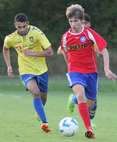 Torsdag aften skulle et stærkt U19 mandskab et smut til Brøndby, hvor et ærgerligt resultat fra forrige kamp, skulle slettes fra hukommelsen. Vi kommer rigtig stærkt fra start, og især vores spil inde omkring midten, hvor Niko, Luka og Malling sidder på det hele. Den første store chance kommer efter 10 minutters spil, hvor Albert afdribler en mand, og stikker Andy i dybden. Desværre bliver vinklen for skarp, og afslutningen ryger lige forbi fjerneste stolpe. Så var Brøndby advaret! Efter 18 minutter får vi hjørnespark der bliver headet ud til Niko igen, der med det samme lægger den til rette for Noam, som sparker den ind i feltet. Efter Andy får sendt den videre, ender bolden hos Albert der hamrer bolden i kassen uden chance for keeperen. Verdensklasse flugter, og forløsning på sidelinjen. Resten af halvlegen kommer Brøndby bedre med, og de spiller især på kontra. Martin og Magnus styrer det hele fra bagkæden, og det bliver ikke til mere end halve chancer. Pausestilling 0-1. 2. halvleg er knap nok begyndt før Brøndby får frispark et godt stykke ude. Bolden bliver sparket ind i feltet, hvor en masse tumult opstår, og til sidst står en Brøndby spiller helt fri og sparker den ind tæt under mål. Kæmpe mavepuster, da det er deres første reelle skud på mål. Vi svarer heldigvis hurtigt igen, og få minutter efter kombinerer vi os flot igennem alle kæder, hvor Luka modtager bolden, og lægger en sukkerbold i dybden. Andy tager den køligt rundt om målmanden, og sparker den sikkert ind. 2-1. Kort efter føringsmålet kommer Brøndby på 2-2. Op på hesten gutter, og videre! I 66 minut sender Niko en dødbold bagerst i feltet, hvor Magnus står helt alene. Målmanden prøver at redde den, men det hele resulterer i at Magnus står alene med bolden, og sparker den ind fra kort afstand. Så var vi igen foran. Desværre får Albert et gult kort for at sparke bolden væk. Brøndby presser naturligvis på med en mand i overtal. To personlige fejl resulterer i to hurtige mål til Brøndby. 4-3……. Heldigvis får Brøndby også et gult kort, og skal spille kampen færdig med en mand i undertal. I det 83. minut kommer udligningen så. Dejligt mål af Andy. For anden kamp i streg spiller vi bedre end modstanderen, og skaber så mange chancer. Vi skal være mere effektive foran mål, og de personlige fejl skal mindskes. Det er dejligt at se gutterne følge vores gameplan, og vi kan se massere af udvikling med vores spil kamp for kamp. MOTM er Niko der igen spiller en fremragende kamp på midten. Køligt overblik, og lunger som Kanté. Det var en sand fornøjelse, at følge på siden. Nu gælder det 3 point imod Bytoften på lørdag.