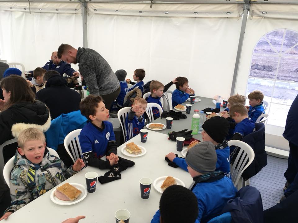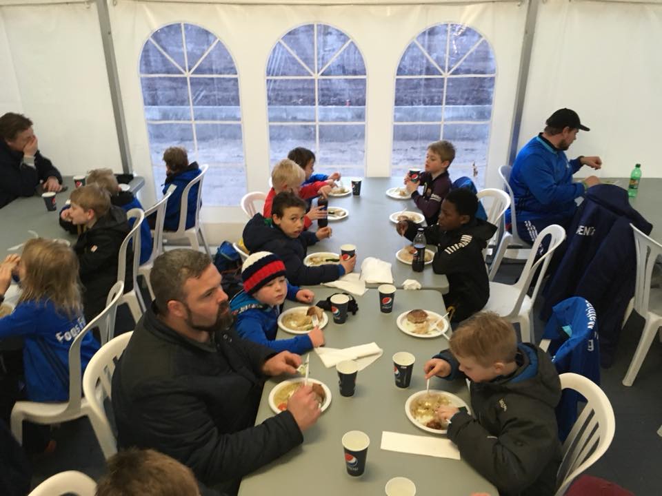 Efter formiddagens første 6 kampe var det tid til frokost, som blev indtaget i et stort telt, der var sat op til lejligheden. Drengene fik serveret sandwich, ligesom nogle valgte at bruge deres medbragte penge på hotdogs og sodavand. Næsby boldklub har et fantastisk anlæg, der indbyder til leg både med og uden bold. Det blev flittigt brugt mellem kampene og drengene legede rigtig godt sammen på kryds og tværs og alle var en del af fællesskabet.