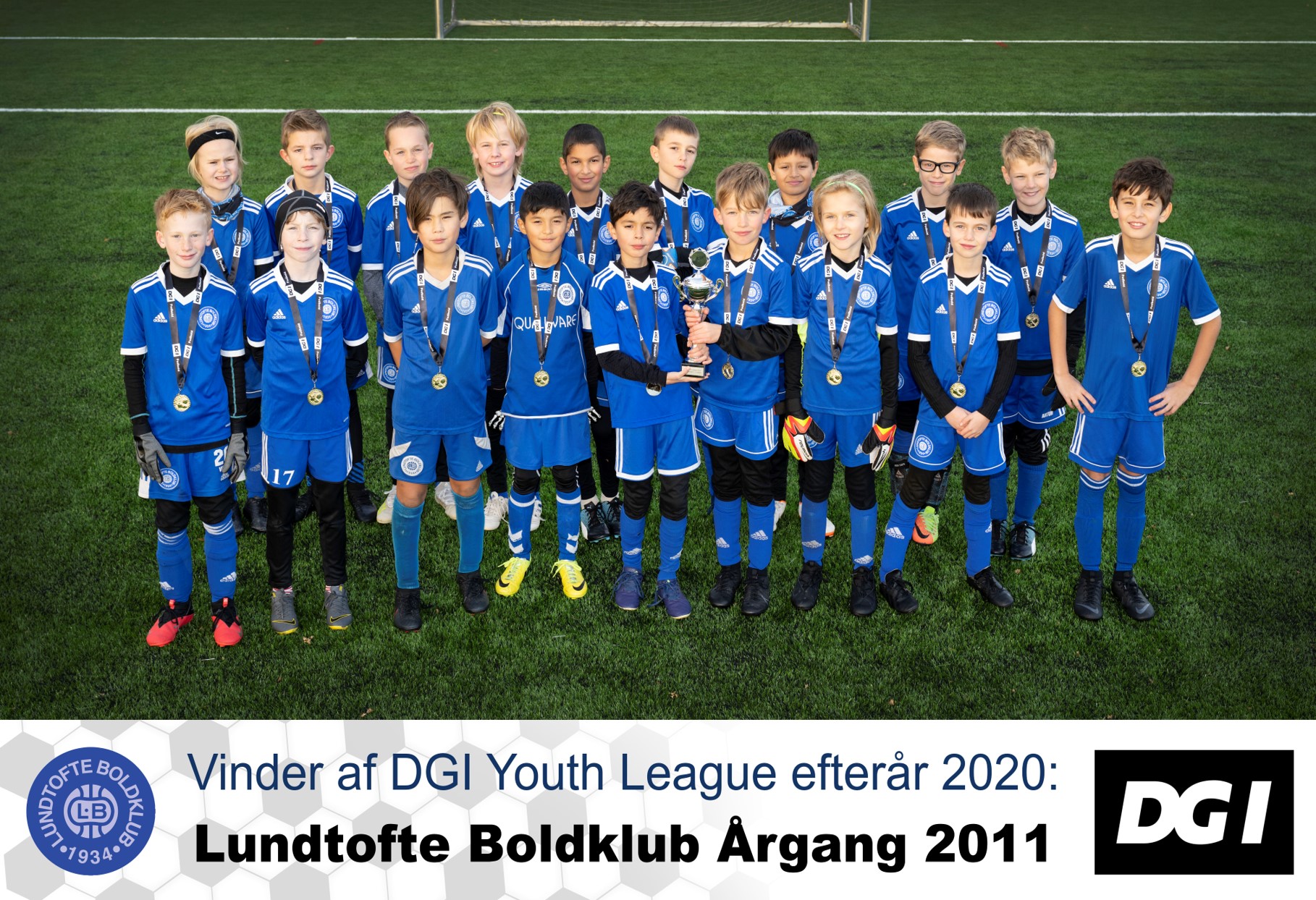 Vi kan med glæde berette, at Lundtofte Boldklub Årgang 2011 for nylig vandt DGI Junior League Efterår 2020 i 8-mands fodbold. Vi har en flot pokal til klublokalet (når vi kan komme derind igen) og en masse glade og stolte drenge på holdet.