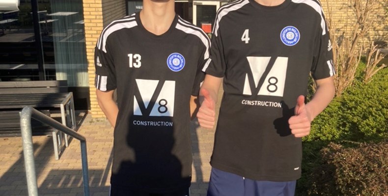 Tinus og Silas i fint træningstøj m V8 som sponsor.